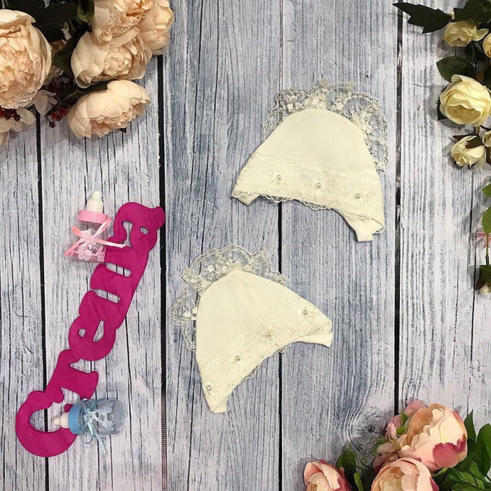 Чепчики из интерлока-пенье. Украшены кружевом.